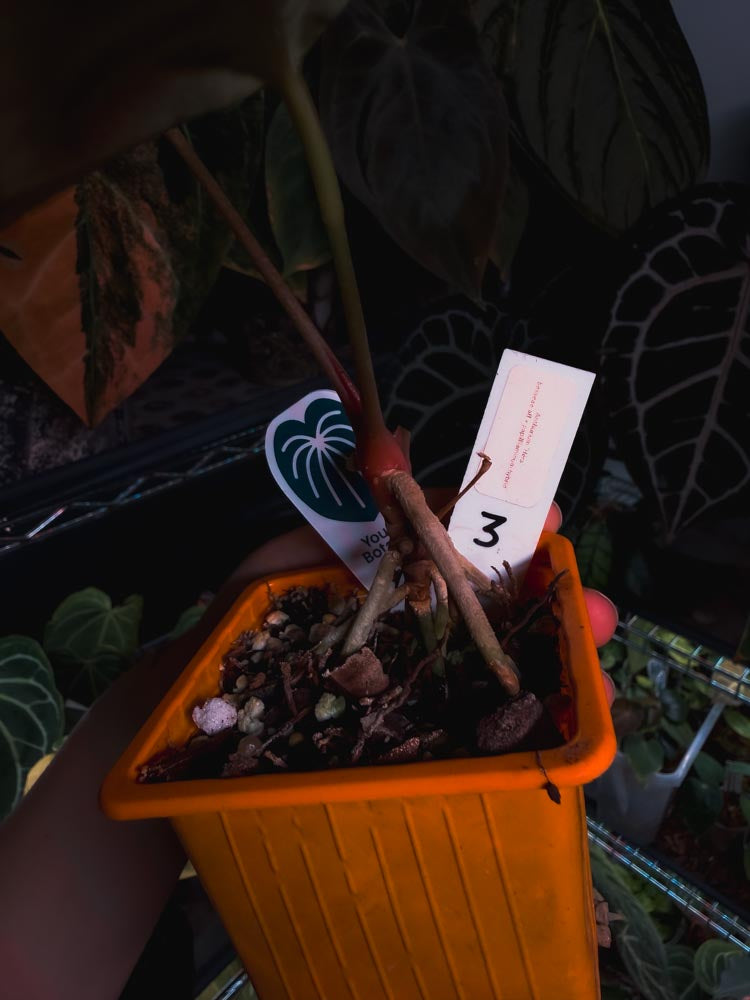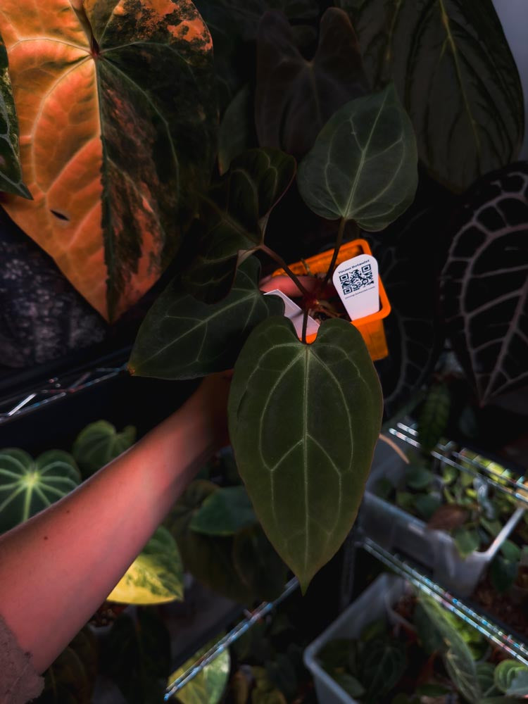 Anthurium 'HÉRA' (Besseae aff round form x Papillilaminum hybrid), de taille moyenne.